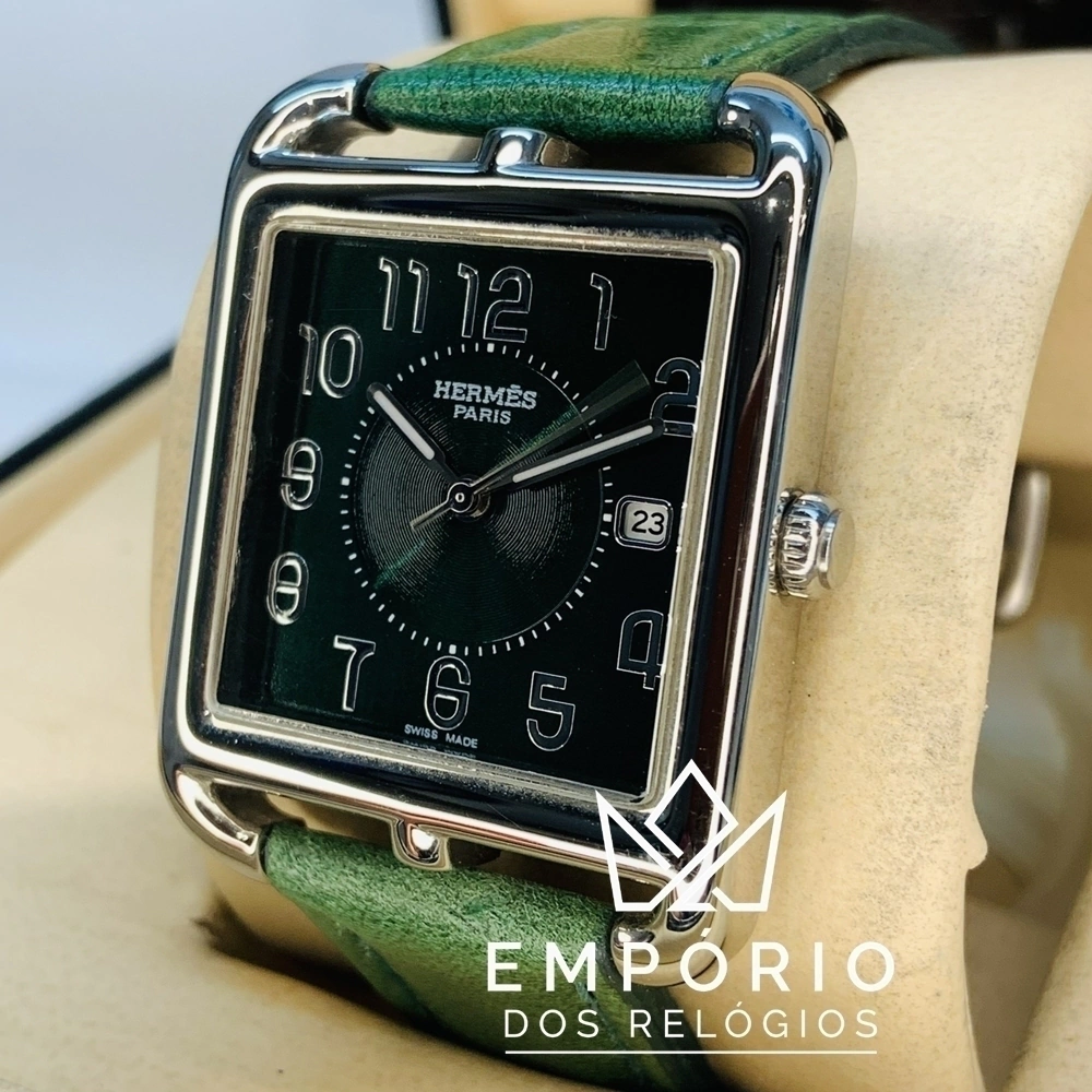 Relógio Hermès modelo Cape Cod com mostrador verde, algarismos árabes, ponteiros luminescentes e função. Caixa em aço e pulseira de couro verde.