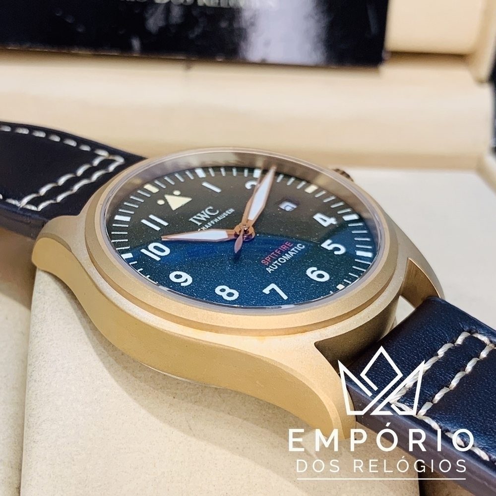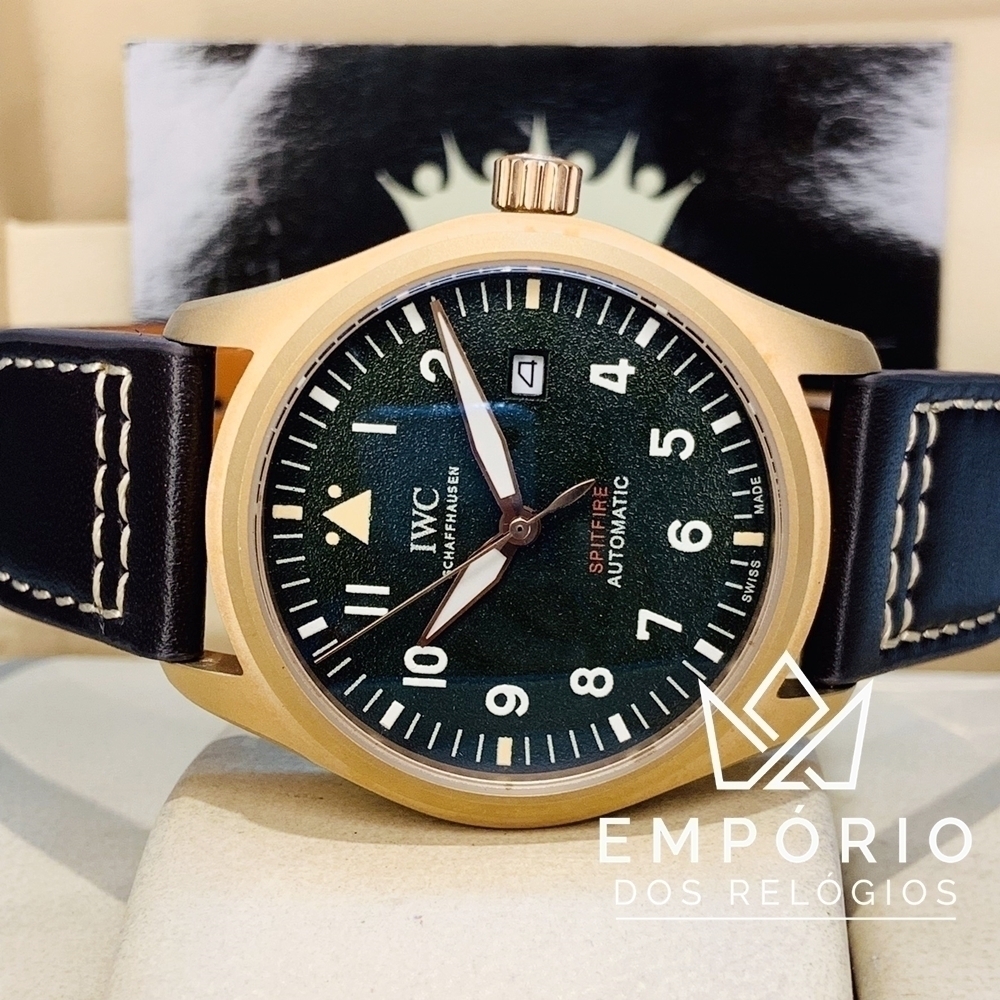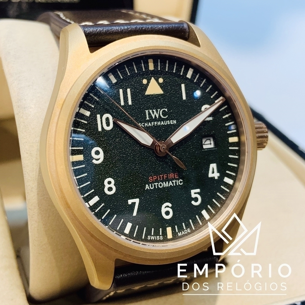 Relógio IWC Pilot's Watch Aviador Automático modelo IW326802 com mostrador verde, detalhes em branco e bronze, números árabes, ponteiros luminescentes e função data. Caixa em aço com banho de bronze e pulseira de couro marrom.