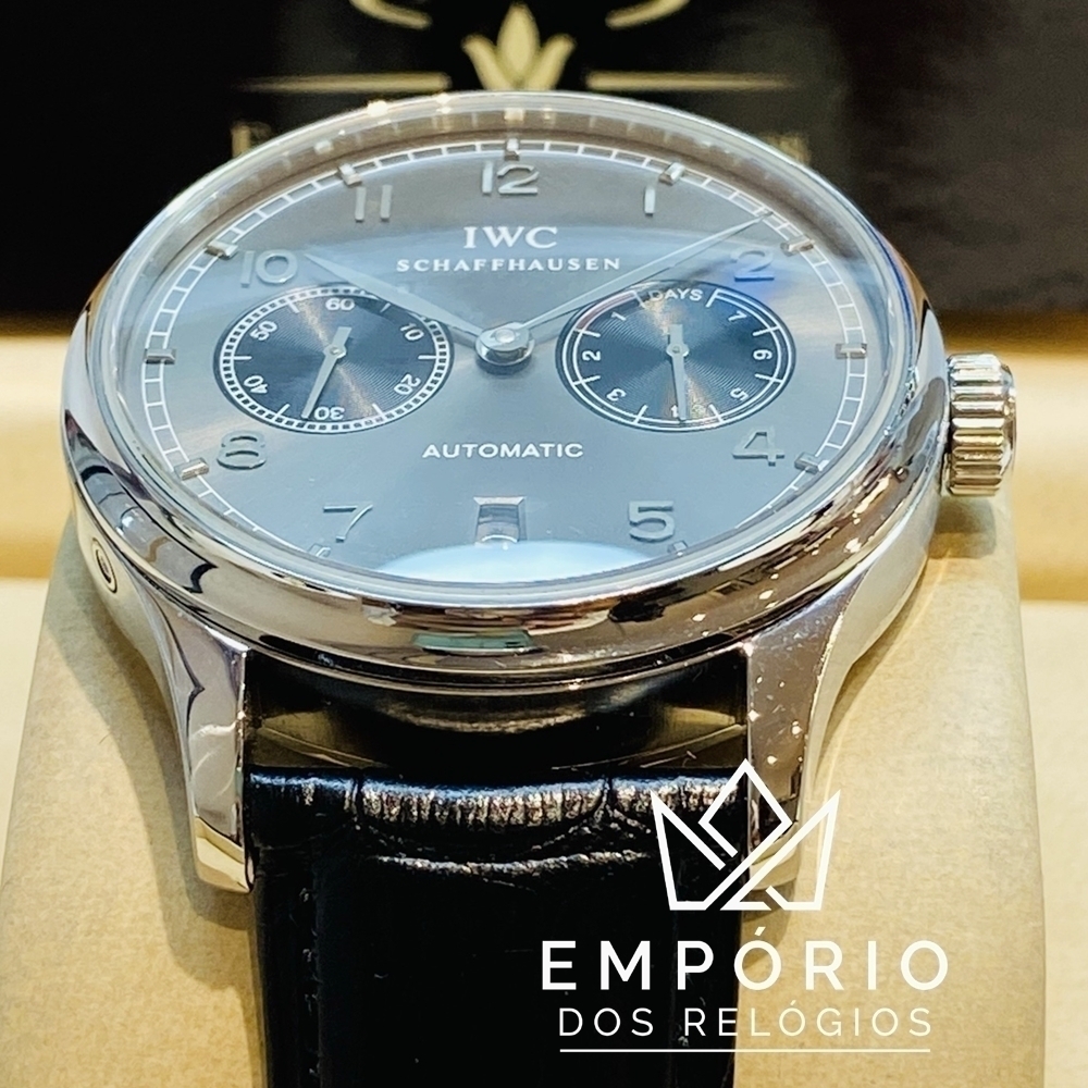 Relógio IWC Portugieser Cronógrafo Automático com mostrador cinza, números árabes e função data. Ponteiros e marcadores de hora em aço. Função cronógrafo - dois submostradores. Parte do fundo transparente de forma a ser visível o movimento. Caixa em aço e pulseira de couro preto modelo crocodilo.