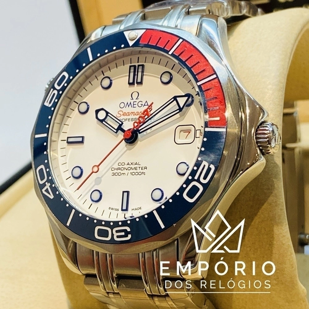 Relógio Omega Seamaster Diver 300M Chronometer 007 “Commander's Watch” Edição Limitada com mostrador branco, detalhes em azul e vermelho e função data. Os ponteiros de horas e minutos são vazados em azul e ponteiro de segundos vermelho com o emblema de arma 007 na ponta. O relógio é uma homenagem posto de Comandante de James Bond e segue as cores da bandeira da Marinha Real Britânica. Luneta giratória unidirecional nas cores azul e vermelha com escala de mergulho. Caixa e pulseira de aço.