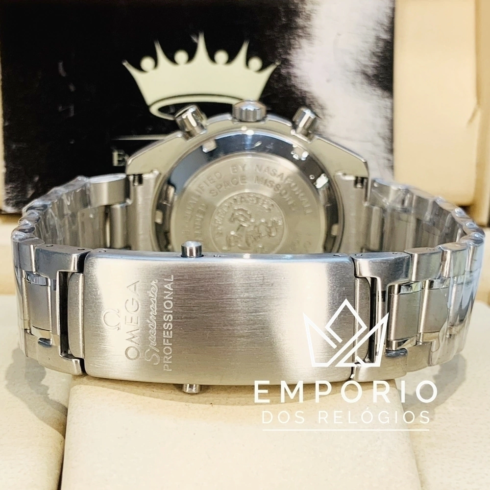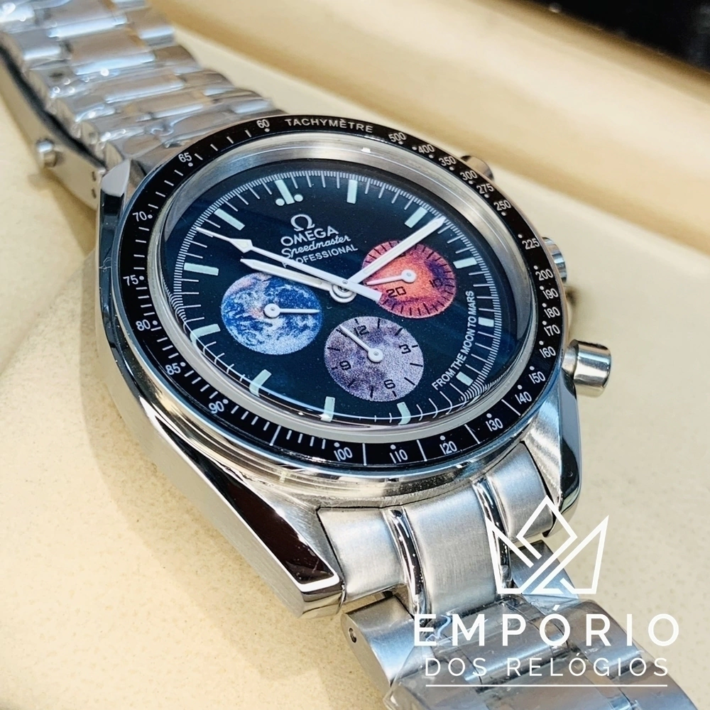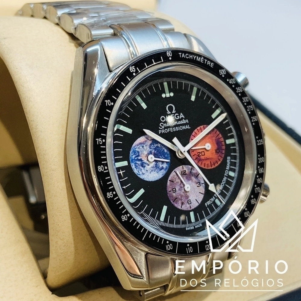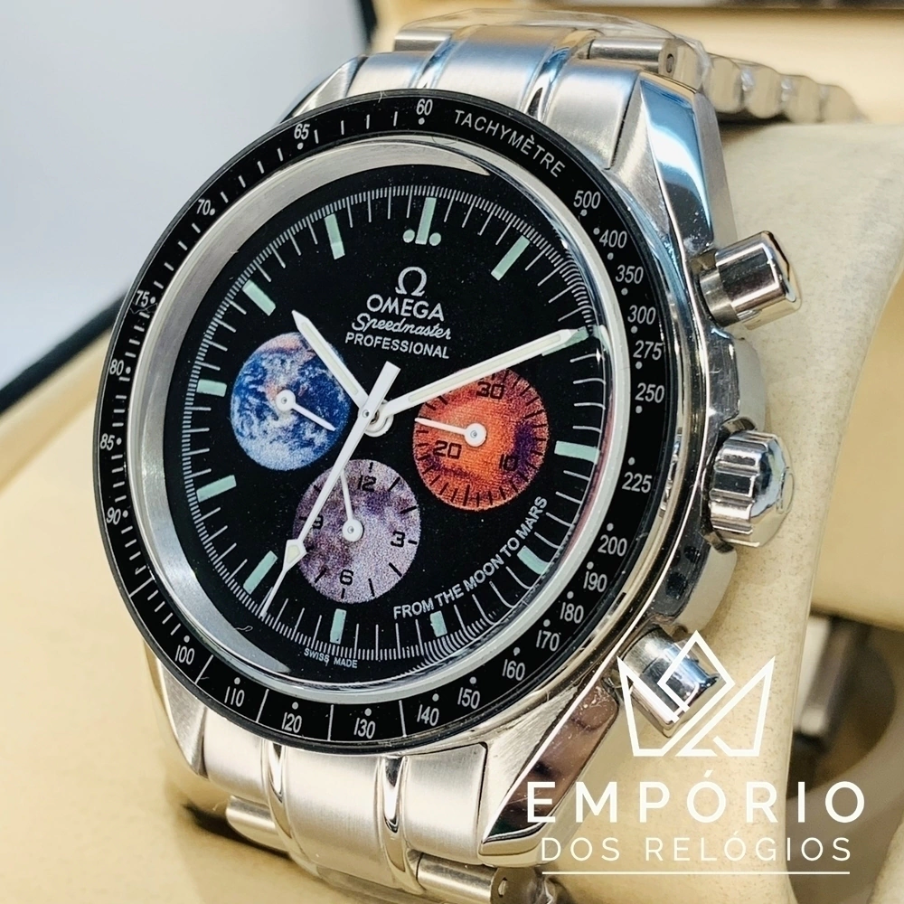 Relógio Omega Speedmaster Professional “From Moon to Mars" Chronograph 3577.50 com mostrador preto, ponteiros e marcadores luminescentes. Os submostradores estão desenhados, de forma inteligente, como Terra, Marte e Lua. Função cronógrafo - três submostradores. Luneta rotativa unidirecional preta com escala taquimétrica. Caixa e pulseira em aço.