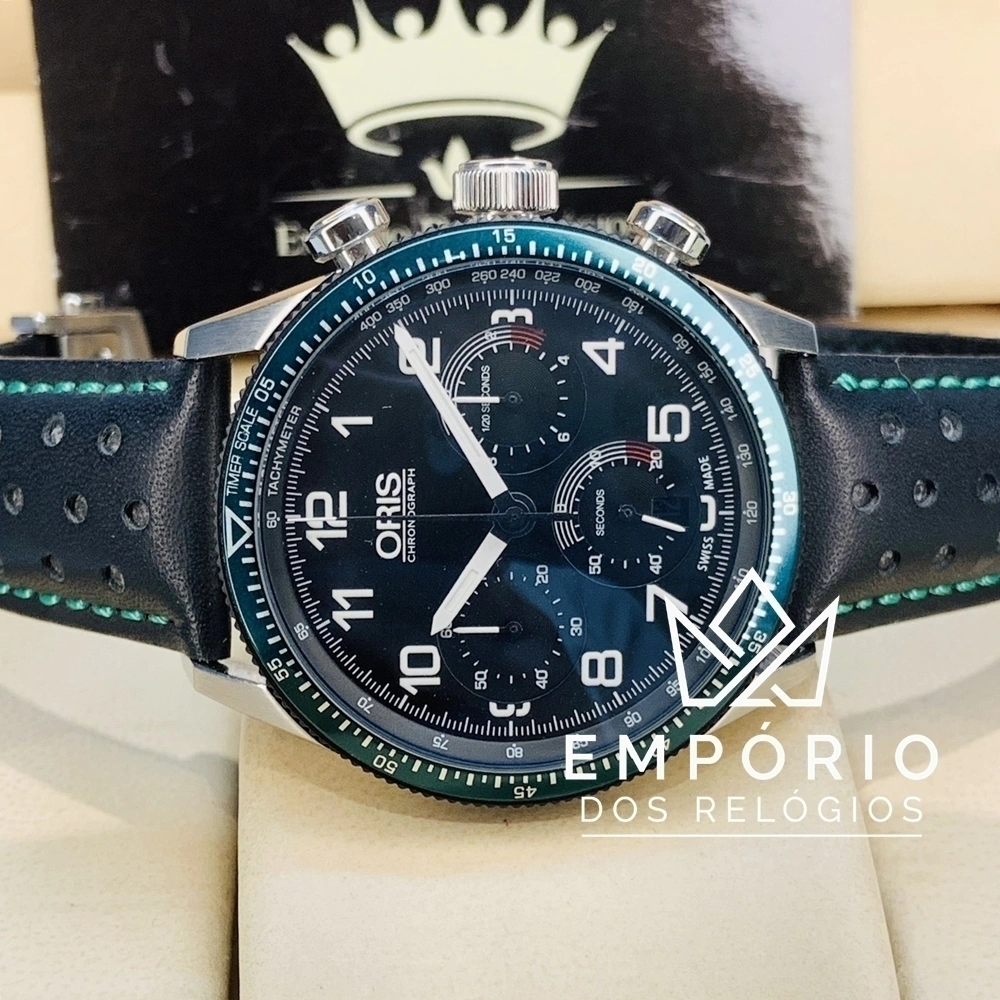 Relógio Oris Calobra Chronograph com mostrador preto, ponteiros e marcadores luminescentes e função data. Luneta unidirecional giratória de cerâmica verde com numerais e graduações. Função cronógrafo - três sub-mostradores. Caixa em aço e pulseira de couro preto pesponto verde.