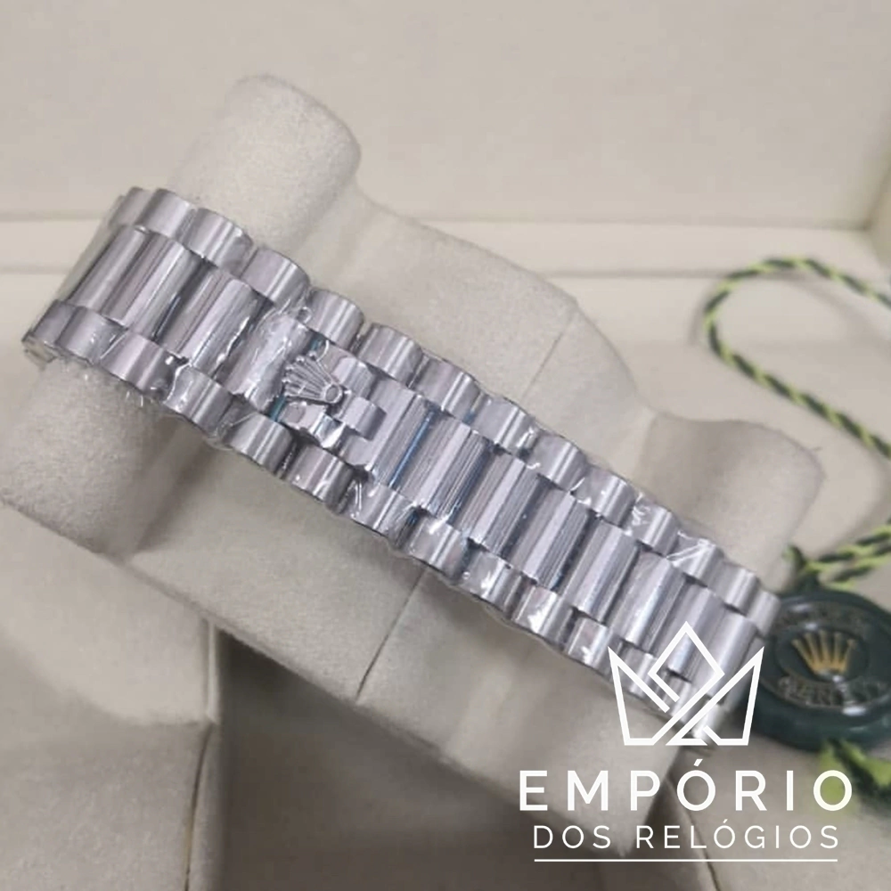 Relógio Rolex Day-Date 40 com mostrador azul glacial, algarismos romanos, detalhes em azul escuro e data com mudança instantânea. Lente cyclops que aumenta a abertura da data. Indicação do dia da semana em abertura em forma de arco. Luneta lisa. Caixa em aço e pulseira modelo Presidente com três fileiras de elos semicirculares.