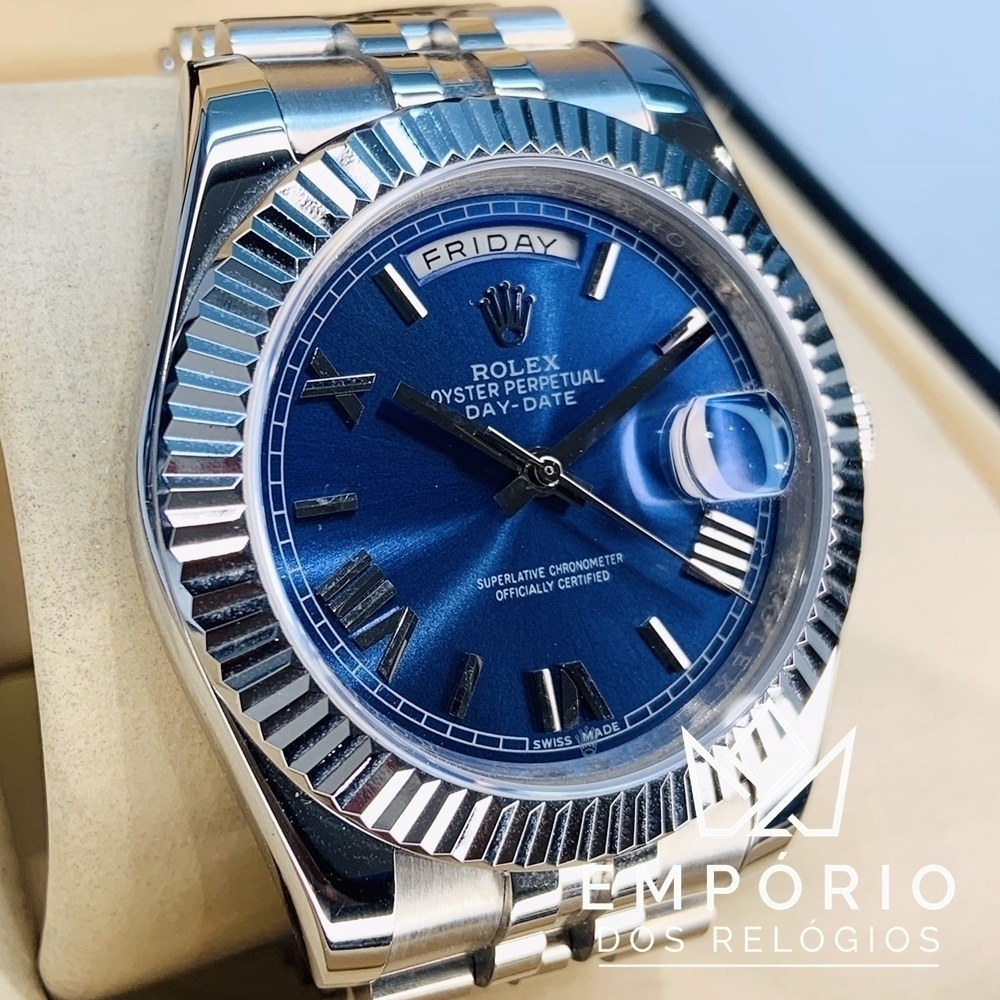 Relógio Rolex Day-Date 40 com mostrador azul, algarismos romanos e data com mudança instantânea. Lente cyclops que aumenta a abertura da data. Indicação do dia da semana em abertura em forma de arco. Luneta canelada. Caixa em aço e pulseira modelo Jubileu com 5 fileiras de elos.
