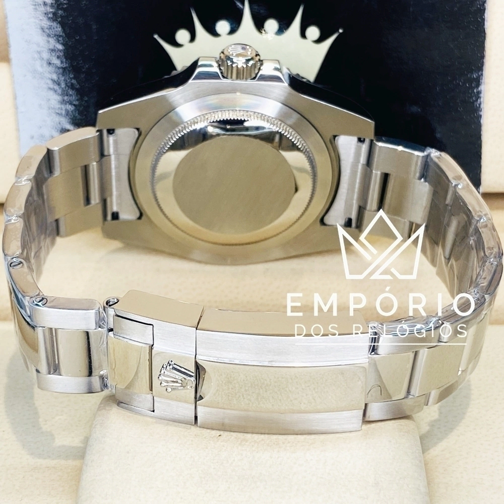Relógio Rolex GMT-Master II Pepsi com mostrador preto, ponteiros luminescentes e data com mudança instantânea. Lente cyclops que aumenta a abertura da data. Luneta de cerâmica bicolor (azul e vermelha) giratória bidirecional graduada 24 horas. Caixa em aço e pulseira com três fileiras de elos planos.